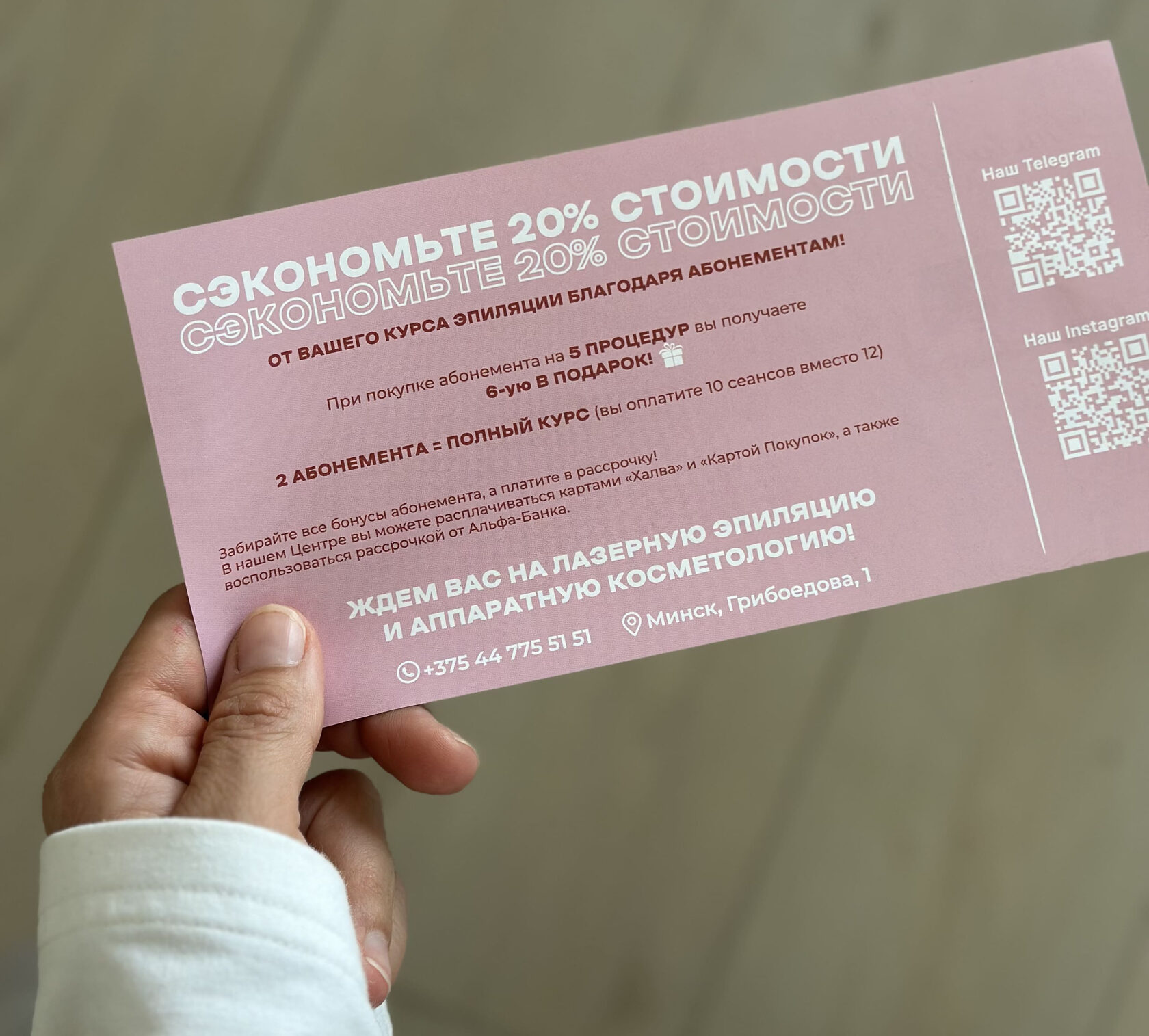 В нашем центре есть система выгодных абонементов, с помощью которых вы можете сэкономить при прохождении курса лазерной эпиляции от 214 до 438 BYN (для женской эпиляции) и от 324 до 1332 BYN (для мужской эпиляции).